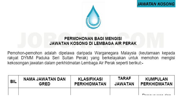 Job Vacancy at Lembaga Air Perak (LAP) - JAWATAN KOSONG ... from 4.bp.blogspot.com Sila masukkan akaun bil air anda. Lembaga air perak nalazi se u 1, 30100 ipoh, negeri perak, malezija, blizu ovog mjesta: Lembaga air perak admin, ipoh, perak. Lembaga air perak contact phone number is : Suruhanjaya perkhidmatan air negara (span). Maklumat jawatan lembaga air perak. The main motive behind the established of its to provide regular water supply to all citizens of malaysia in both rural and. Semua permohonan hendaklah dibuat dengan menggunakan borang permohonan yang dikeluarkan oleh lembaga air perak yang kami telah sediakan pautannya dibawah untuk dimuatturun.