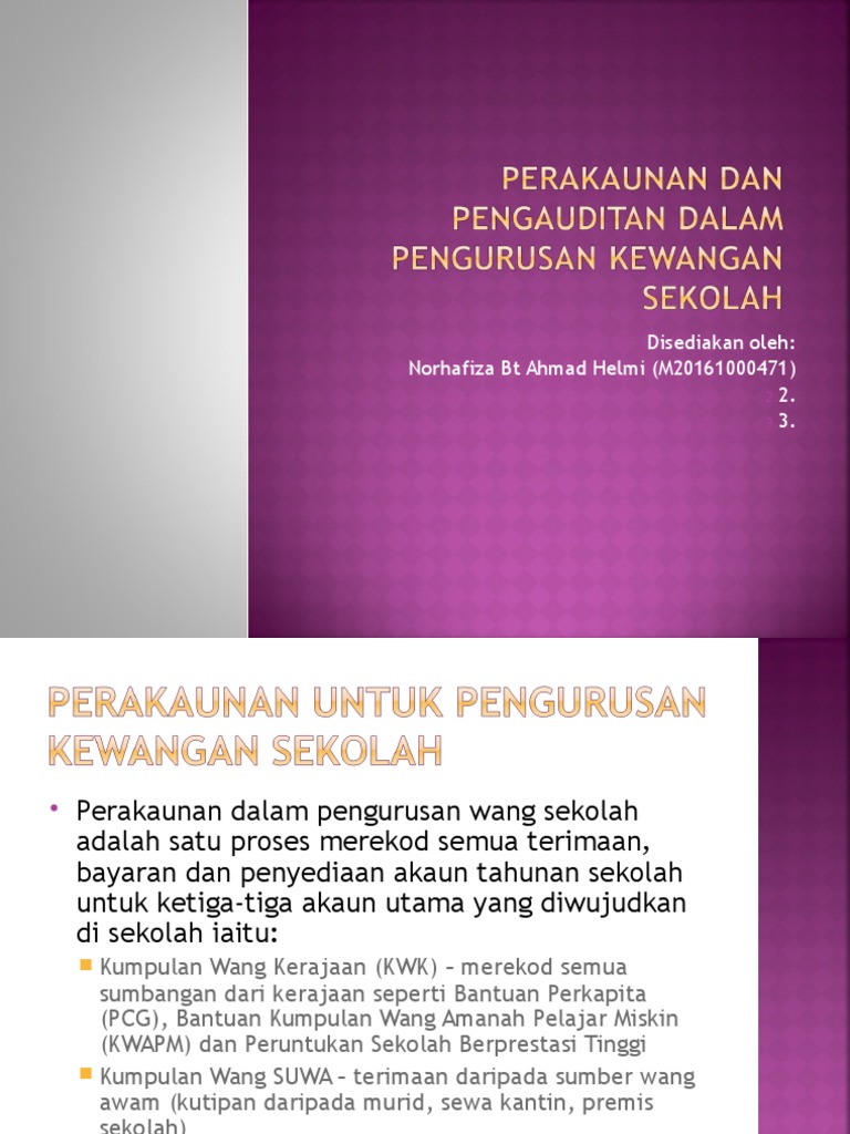 Sistem Pengurusan Kewangan Sekolah - Pengurusan kewangan sekolah (pengurus) - PPT Powerpoint - Azizan bin che omar ketua kerani.. Menentukan pengurusan kewangan di sekolahnya dengan cekap dan berkesan. Penyata kewangan juga digunakan untuk mengawasi pencapaian pekerja dan ia diperlukan untuk tujuan pencukaian. Sejauhmana pengurusan kewangan di sekolah dapat dilaksanakan dengan sistematik adalah bergantung kepada kemahiran, kepimpinan dan sikap pengetuanya. Kepatuhan pengurusan kewangan di sekolah menengah kebangsaan harian di negeri kedah. Fail meja penolong kanan kurikulum.
