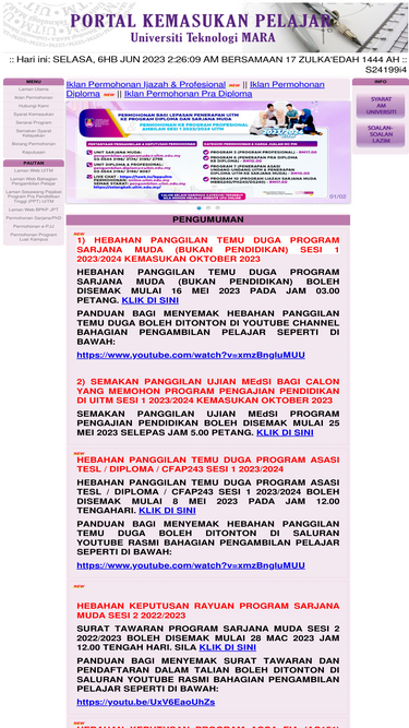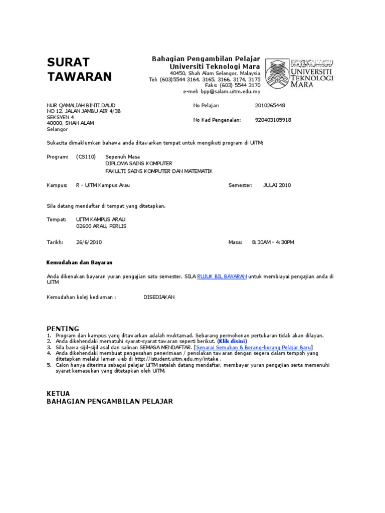 Laman web bahagian pengambilan pelajar. Terdapat juga ambilan khas bagi program tertentu yang akan diumumkan oleh bahagian pengambilan pelajar uitm. Diuruskan sepenuhnya oleh bahagian pengambilan pelajar. Laman web bahagian pengambilan pelajar; Permohonan kemasukan ke uitm sesi akademik 2 2013/2014. Seorang penuntut universiti teknologi mara (uitm) melaka maut apabila motosikal ditunggangnya dirempuh sebuah ambulans. Pengambilan kumpulan pertama pelajar sesi jun 1999 ialah seramai 166 orang. Pemohon dinasihatkan untuk sentiasa melayari facebook bahagian pengambilan pelajar uitm untuk mendapatkan maklumat terkini permohonan. Bahagian pengambilan pelajar uitm, shah alam, malaysia. Unit pengurusan kebajikan pelajar aras 3, bangunan budisiswa bahagian hal ehwal pelajar universiti teknologi mara 40450 shah alam tel : Anda boleh merujuk ke bahagian berikut: Pihak uitm mengucapkan terima kasih di atas minat saudara/saudari memohon memasuki uitm. Bahagian pengambilan pelajar uitm 3.